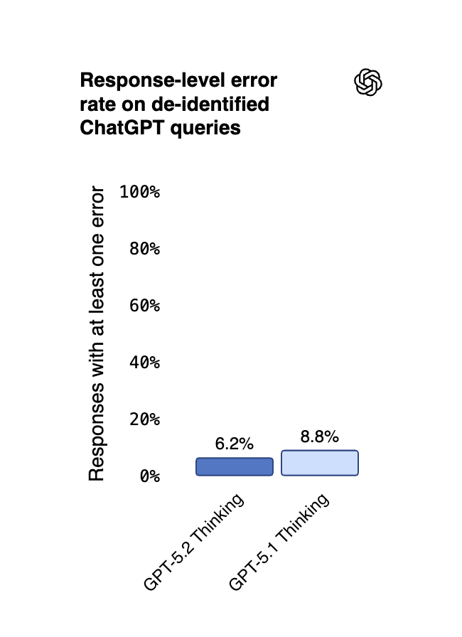 While error rates dropped 30% relative to GPT-5.1, GPT-5.2 still produces errors in 6.2% of responses. For critical decisions, OpenAI recommends double-checking answers against authoritative sources. Claim-level error rates are lower than response-level rates since most responses contain multiple claims.